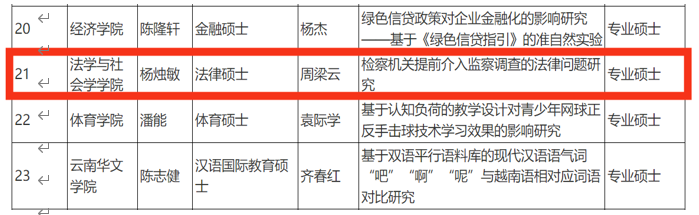 此次评选依据《云南省学位委员会办公室关于开展2024年优秀博士、硕士学位论文评选工作的通知》要求,由校内外专家评审组现场评审,采取无记名投票表决的方式进行评选,拟推荐出31篇省级优秀博士、硕士学位论文,其中拟推荐的省级优秀硕士学位论文有26篇。杨烛敏的论文深入研究了监察体制改革中的法律实务难题,凭借扎实的理论基础和创新的研究视角,在众多参评的学位论文中脱颖而出。
