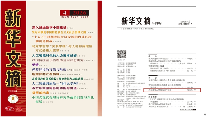 近日,公司周大鸣教授文章《从交通看人口的流动与链接》(原刊登于《探索与争鸣》2025年第10期)被《新华文摘》2026年第4期全文转载。