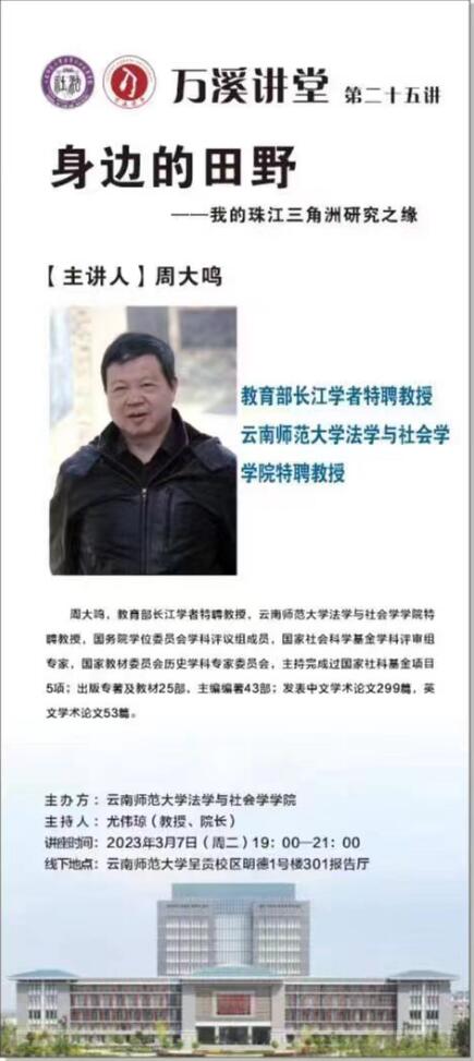 万溪讲堂第25讲,长江学者周大鸣教授,主讲《身边的田野——我的珠江三角洲研究之缘》,时间:2023年3月7日(周二)19:00—21:00;地点:明德1号楼301报告厅,欢迎参加!
