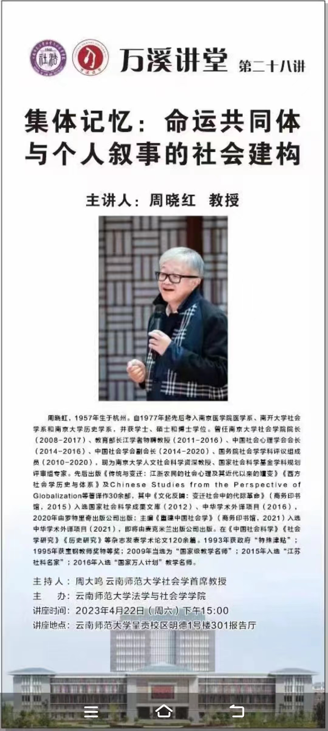 万溪讲堂第28讲,周晓虹教授主讲《集体记忆:命运共同体与个人叙事的社会结构》