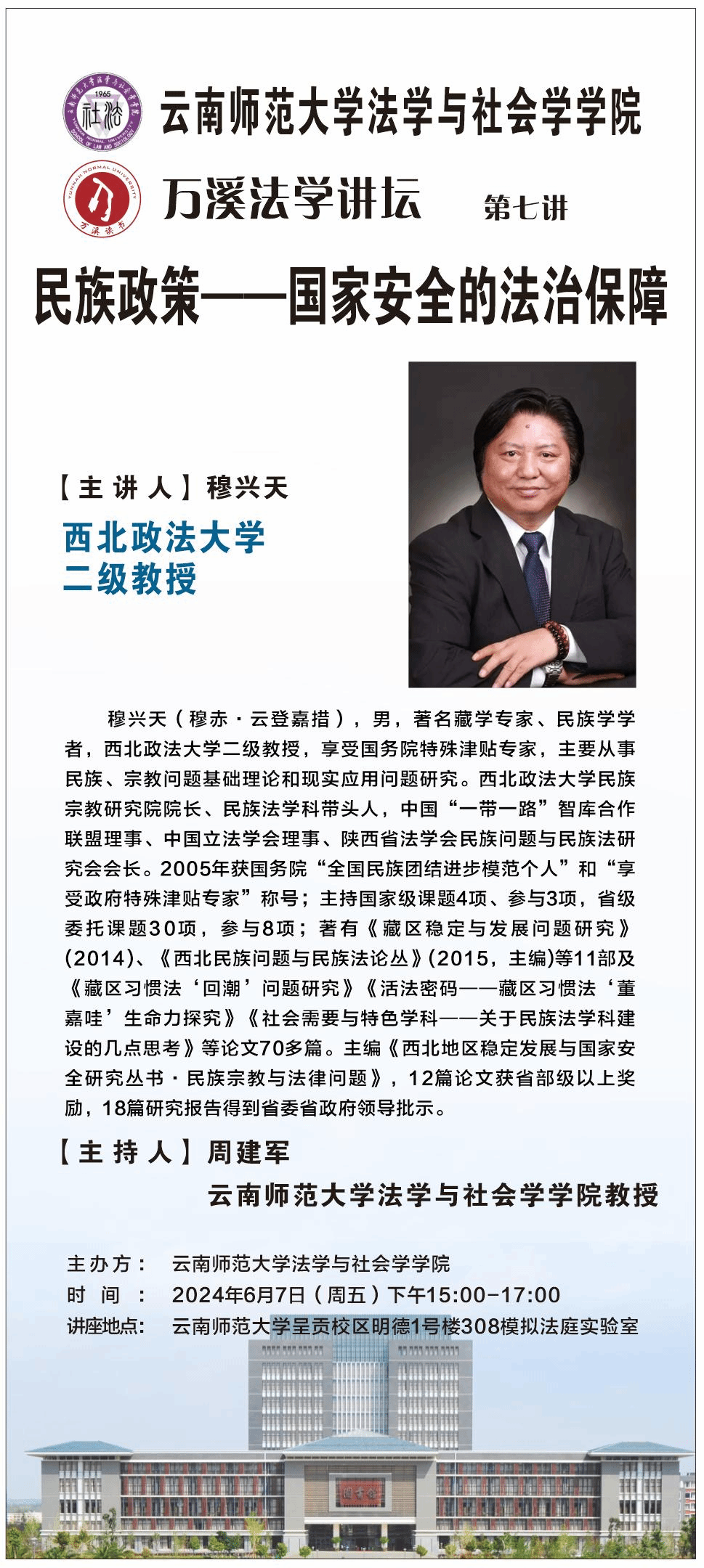 万溪法学讲坛第七讲海报 主讲人 穆兴天教授:民族政策——国家安全的法治保障