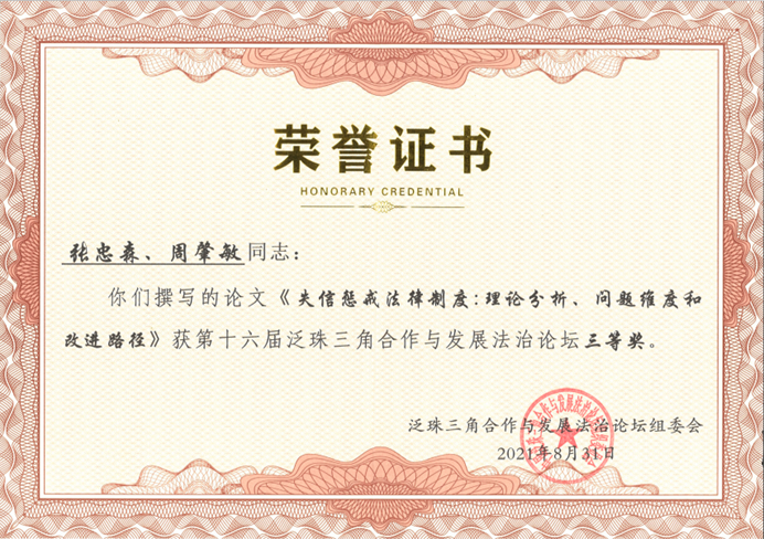 为深入学习贯彻习近平法治思想,经中国法学会同意,以“公共法治平台与区域热点法律问题”为主题的第十六届泛珠三角合作与发展法治论坛拟适时在云南省举办。在本次论坛征文中,公司周梁云教授指导的法律硕士研究生杨烛敏撰写的论文获二等奖,张忠森撰写的论文获三等奖,同时也是本次比赛云南省高校仅有的两名获奖研究生获奖者将参加论坛并作专题发言。