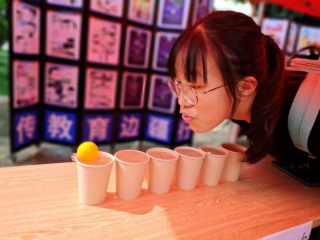 在“同心协力,抵制毒品”这一环节,参与者通过把放在装满水的纸杯里的乒乓球从第一个杯子吹到最后一个杯子中,成功之后在箱子里随机抽取一张纸条,再辨认纸上的名称是否是毒品,识别成功之后可获得一枚贴纸。