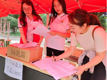 此次活动主要以游园会的形式开展,主要有三个环节,每个环节的内容都与毒品知识有关,参与者每挑战成功一个活动可获得相对应的贴纸,待三个活动都参加完之后,可将获得的贴纸拿至兑奖处兑换奖品,并在禁毒宣传的横幅上进行签名。