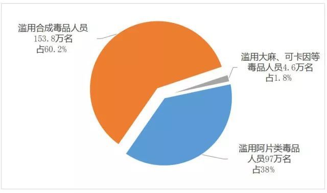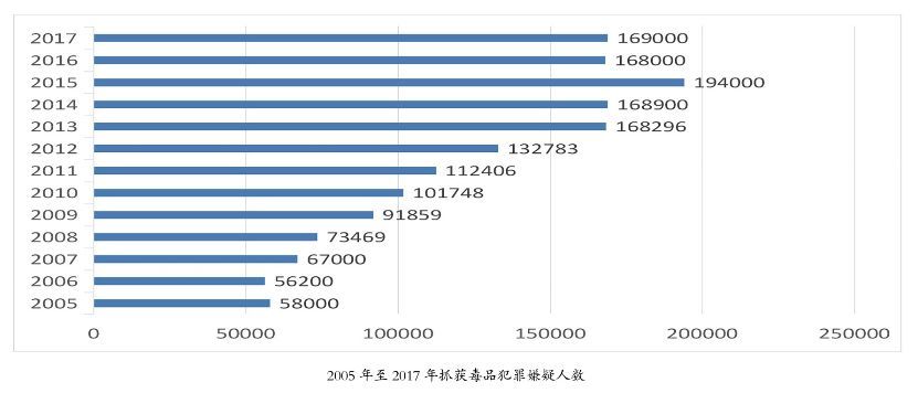 2017年,中国毒品滥用人数仍在增多,但同比增幅下降,现有吸毒人数占全国人口总数的0.18%。尽管中国治理毒品滥用取得一定成效,但毒品滥用问题总体仍呈蔓延之势,毒品种类、滥用结构发生新变化。