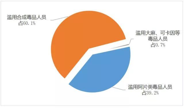 ——合成毒品滥用仍居首位,所占比例出现下降。在全国现有255.3万名吸毒人员中,滥用合成毒品人员153.8万名,占60.2%,较上年下降0.3个百分点;滥用阿片类毒品人员97万名,占38%,较上年下降0.1个百分点;滥用大麻、可卡因等毒品人员4.6万名,占1.8%。2017年,全国新发现吸毒人员34.4万名,其中滥用合成毒品人员占77.1%,较上年下降4个百分点;滥用海洛因等阿片类毒品人员占16.6%,较上年上升0.8个百分点;滥用大麻、可卡因等毒品人员占6.3%。2017年,全国查获复吸人员53.2万人次,其中滥用合成毒品人员占60.1%,较上年下降2个百分点;滥用阿片类毒品人员占39.2%,较上年上升1.8个百分点;滥用大麻、可卡因等毒品人员占0.7%。2017年,合成毒品滥用占比出现下降,大麻、可卡因等毒品滥用占比上升,毒品滥用种类更加多元化。