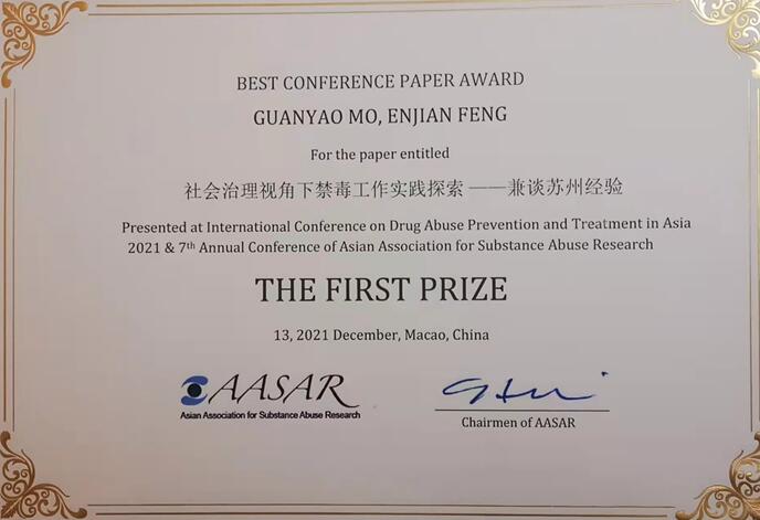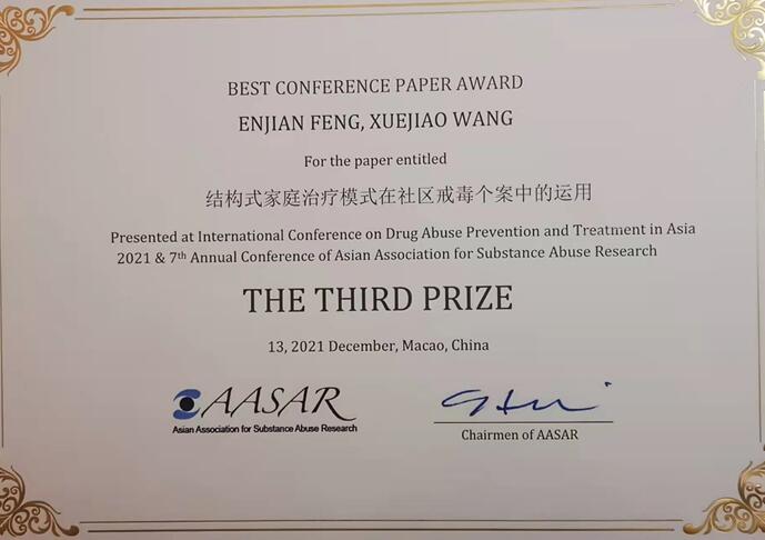 本次会议评选出了优秀论文一等奖2名,二等奖4名,三等奖5名。公司MSW教育中心主任莫关耀教授与其硕士冯恩健的“社会治理视角下禁毒社会工作实践探索—兼谈苏州经验”获得一等奖,社会工作专业冯恩健、王雪娇硕士撰写的“结构式家庭治疗社区在社区戒毒个案中的运用”,莫关耀教授和上海海洋大学李佳薇讲师、冯恩健同学合作的“新时代我国禁毒社会治理策略措施简要回顾”获得三等奖。莫关耀教授和其员工冯恩健、王雪娇硕士在国际禁毒学术会议上为公司、中心挣得了殊荣。