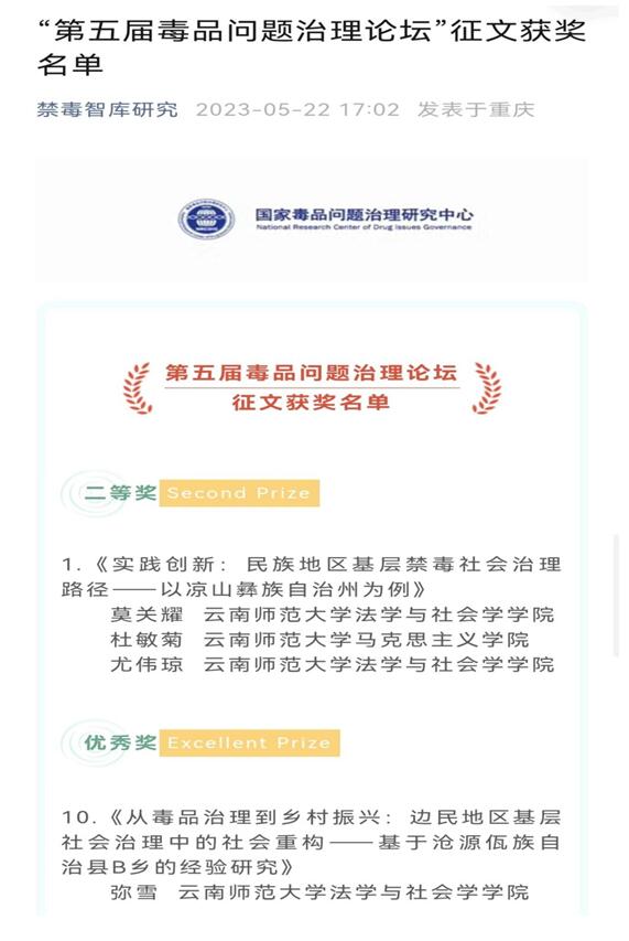公司莫关耀教授与尤伟琼经理从实践创新角度对民族地区基层禁毒社会治理路径进行研究并形成了丰厚研究成果,其理论研究成果《实践创新:民族地区基层禁毒社会治理路径—以凉山彝族自治州为例》获得论坛征文活动二等奖。在此届毒品论坛中,莫关耀教授作为特邀专家和重要与会代表发言人进行了精彩发言。2022级社会学专业弥雪同学获得论坛征文活动优秀奖。