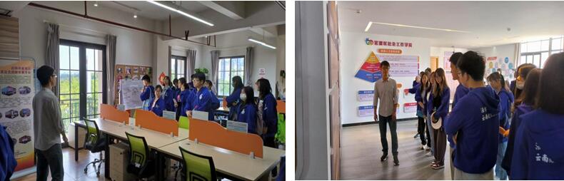 在三楼工作区,工作人员向同学们介绍了入住双创中心的各个社工机构的基本情况。随后,同学们参观了个案工作室、书吧等。