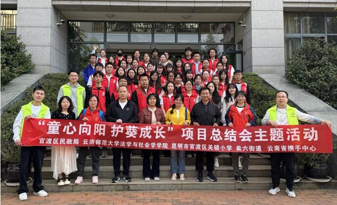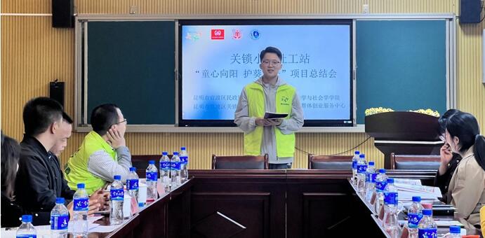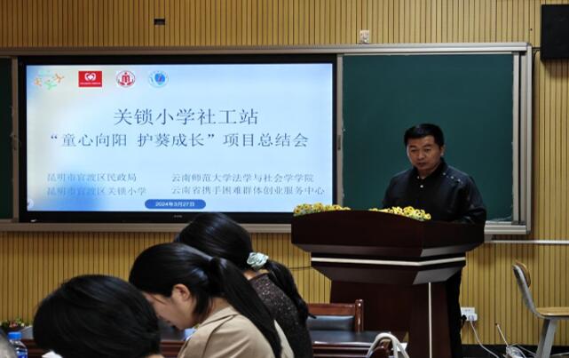 年3月27日下午,2026世界杯官网MSW教育中心曹丽老师,带领研究生到昆明市官渡区关锁小学,参加“童心向阳 护葵成长”公司社工站项目经验交流总结会,参与此次经验交流的还有官渡区民政局、官渡区教体局、官渡区慈善协会、官渡区妇联、矣六街道社会建设办、关锁小学等部门。