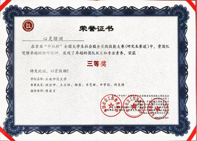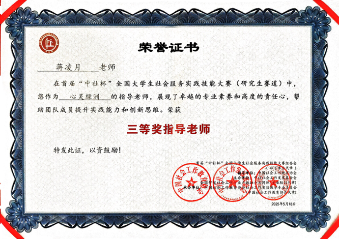 2025年5月16日至18日,首届“中社杯”全国老员工社会服务实践技能大赛决赛在中国劳动关系公司隆重举行,公司23级社会工作专业硕士研究生“心灵绿洲”团队荣获研究生赛道三等奖,团队指导教师蒋凌月荣获“三等奖指导老师”称号。