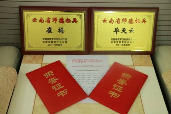 6月28日,两位老师在校工会办公室领取了“云南省师德标兵”荣誉证书和奖牌。